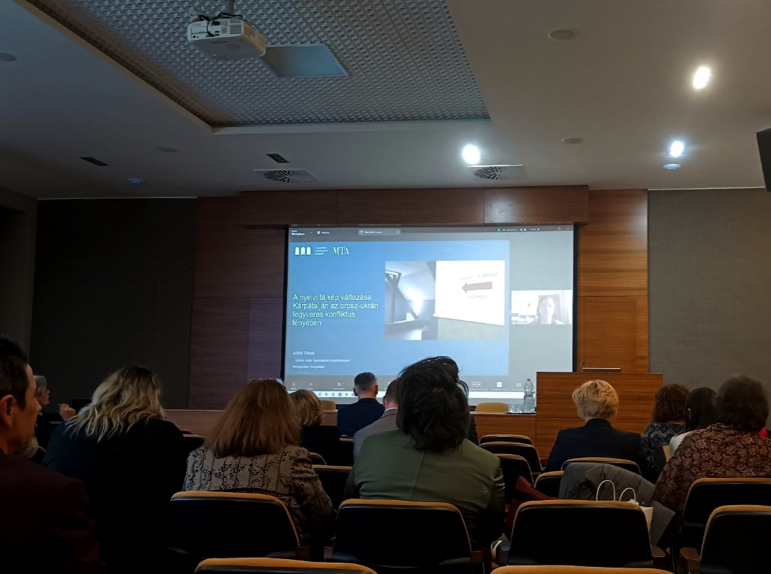 A konferencia II. szekciójában Máté Réka A nyelvi tájkép változása Kárpátalján az orosz-ukrán fegyveres konfliktus fényében c. előadásában bemutatta, a kárpátaljai magyarság 2022. február 24. – a totális háború kitörése – után milyen helyzeteket élt meg, s ezen belül hogyan változott a környezet nyelvi tájképe. A kisebbségi nyelvhasználat lehetőségeinek kiértékelése és nyomonkövetése a mindennapokban prioritást élvező kutatási témává vált intézetünkben, s a nyelvi tájképes elemzéseken keresztül ezeket a változásokat hatékonyan tudjuk személtetni.
